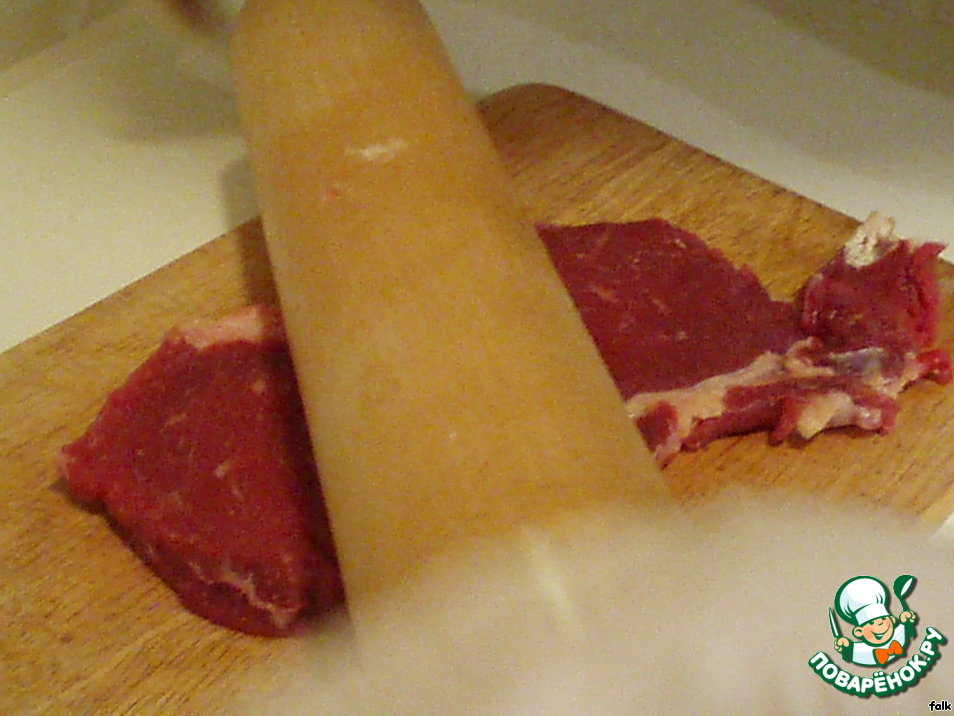 Второй секрет успеха - мясо должно быть как можно тоньше. Отбивая молотком, мы нарушим структуру, поэтому пройдемся скалкой сначала поперек, а потом вдоль куска.