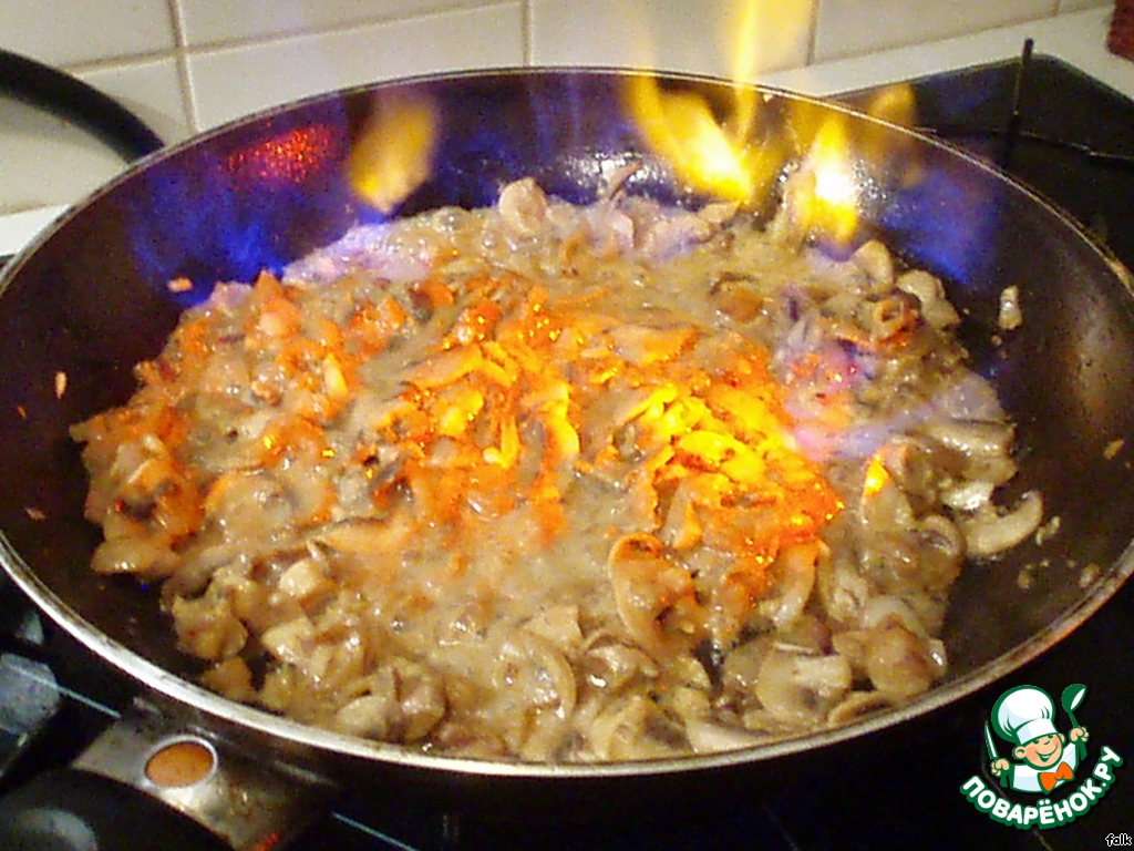 введем коньяк и "зачерпенем" краем пламя. Если у вас электро плита, поджечь длинной зажигалкой. Вытяжку при этом лучше выключить.