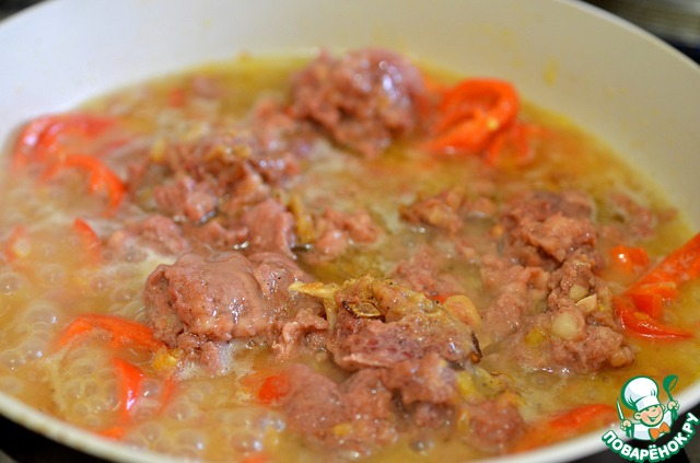 Выложить тушенку к перцу и луку и тушить 2 минуты на среднем огне.