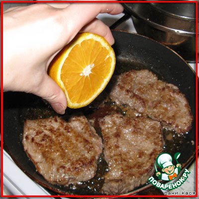 Выдавить апельсиновый сок прямо на горячую сковородку и на отбивные, плюхнуть на отбивные по кружку апельсина, быстро закрыть крышкой (оно фыркает и стреляется маслом), выключить огонь, доходит на минутку