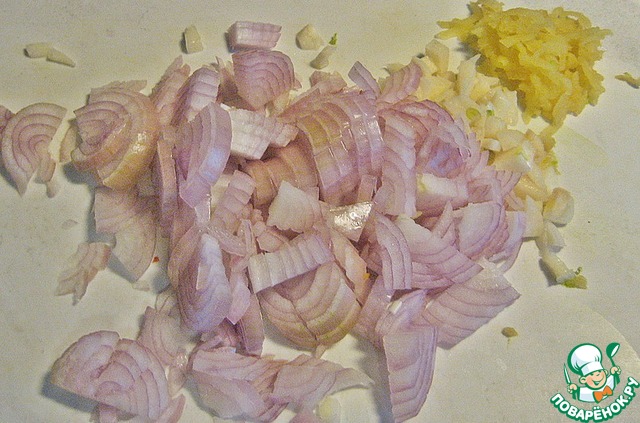Стебель лимонной травы ( она же - лемонграсс) измельчим. По рецепту нужен корень галангала, но поскольку у меня не было, я его заменила цедрой лайма.