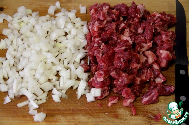 Мясо и лук режем на мелкие кусочки.