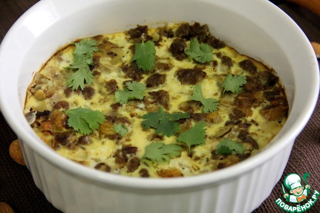 Яйца добавляем в молоко и слегка взбиваем. Обжеренную массу перекладываем в сотейник или другую керамическую форму и заливаем яичной смесью. Сверху кладем лавровые листья. Ставим в предварительно нагретую до 180С духовку на 50 минут.