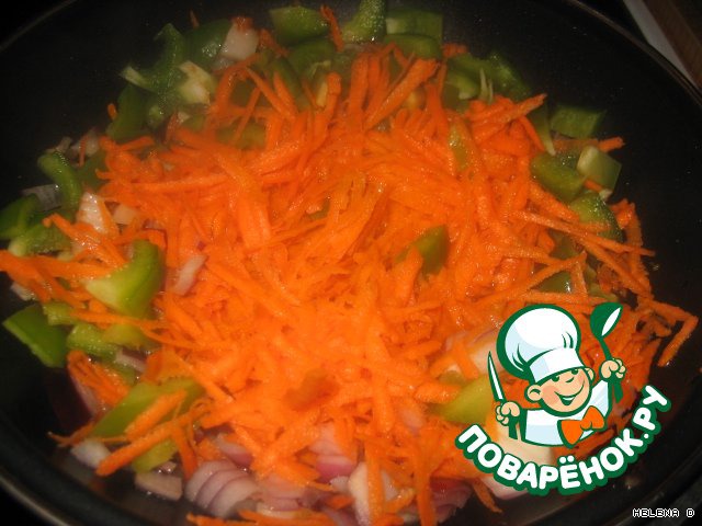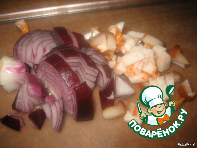 измельчаем лук и перец,трём морковь и обжариваем всё это на сале от грудинки-это придаст специфический вкус нашей картошечке...
