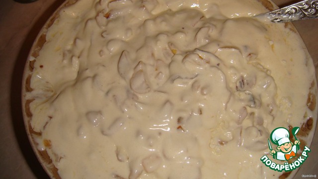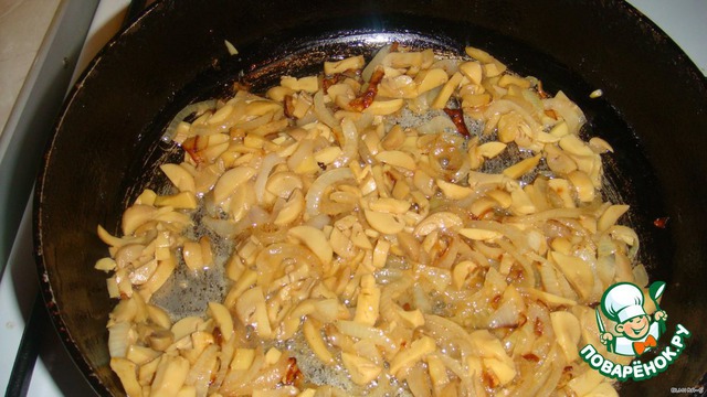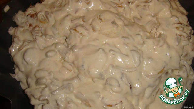 Сметану, обжареные грибыи лук, муку - 1ст.л., соль, перец по вкусу, всё это перемешать.
