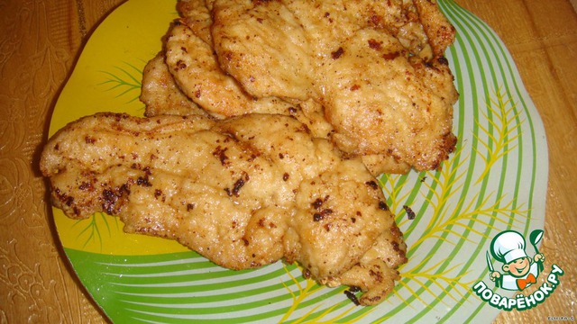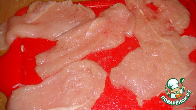 Обвалять в муке отбитые куски курицы и обжарить в масле, только не до готовности.