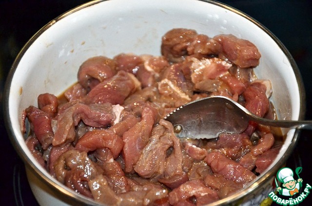 Выкладываем нарезанное мясо в миску. Добавляем соевый соус, сухой испанский херес и крахмал. Перемешиваем. Даем промариноваться.