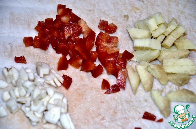 Нарезаем очищенные корень имбиря и чеснок. Измельчаем перец чили.
