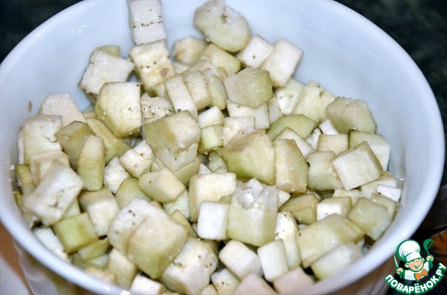 Частично очищаем баклажан полосками. Нарезаем кубиком и солим. Оставляем настояться.