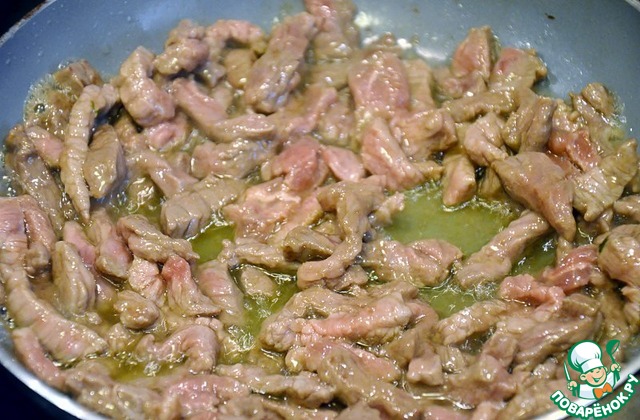 Выкладываем говядину на сковороду со слегка прогретым маслом. Даем мясу чуть посветлеть и откидываем на дуршлаг.