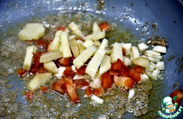 Добавляем в сковороду нарезанный болгарский перец, стручковую фасоль и пластины имбиря. Заливаем горячей водой. Посолим. Накрываем крышкой и оставляем на 15 минут.