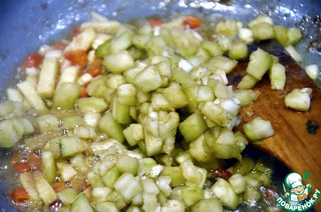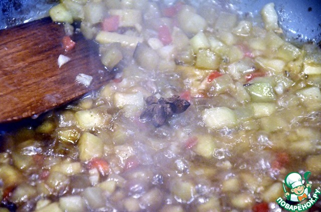 Добавляем баклажаны. Вливаем херес, соевый соус и рисовый уксус. Вливаем немного воды. Тушим.