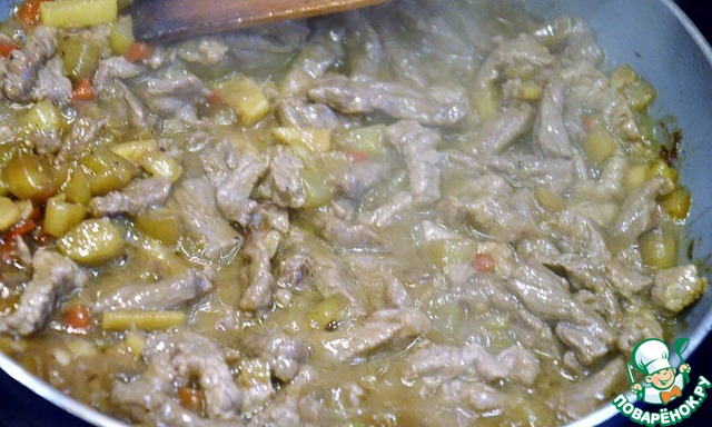 Разводим крахмал водой. Выкладываем говядину. Вливаем крахмал, тушим. В конце тушения добавляем немного кунжутного масла