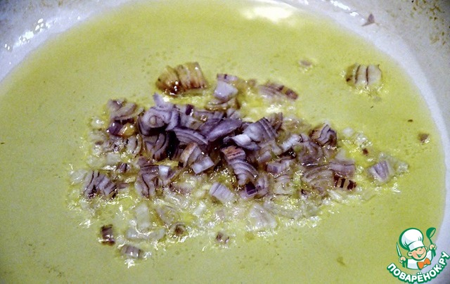 Пока тушится говядина, делаем рис. Обжариваем измельченный репчатый лук на сковороде с добавлением растительного и кунжутного масел.