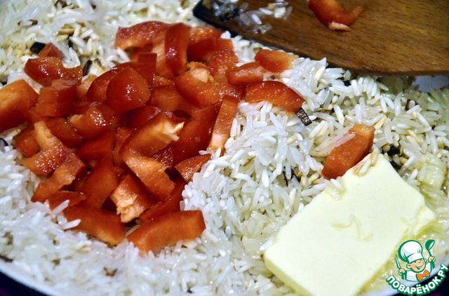 Добавляем зубчики чеснока и рис. Перемешиваем. Добавляем сливочное масло.