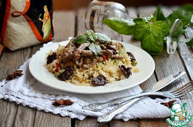 | Очень оригинальное, но безумно вкусное блюдо. Очень-очень ароматное! Говядина получается просто нежнейшая, а рис с разными пряными травами - просто объеденье! |