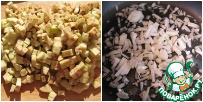 Баклажаны очистить от кожицы и нарезать на небольшие кубики.