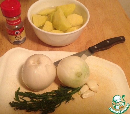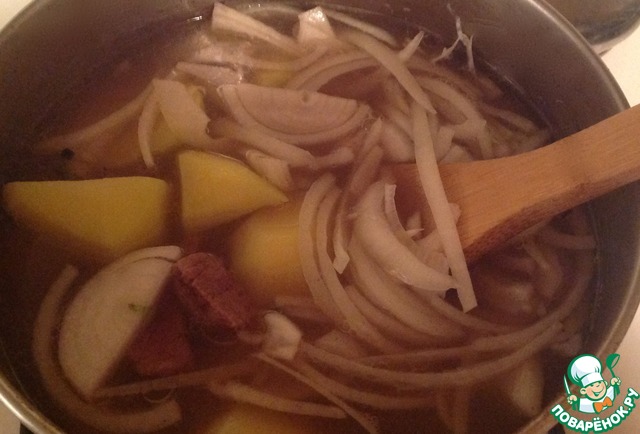 Мясо в нашем ароматном бульоне доводим до почти готовности. Тем временем крупно (на 2-4 части) режем картофель, полукольцами режем лук. Одну луковицу, ту что была поменьше, я оставила сырой.