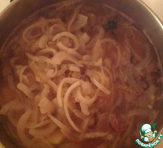 Через 3-4 минуты туда же добавляем обжаренный лук. Накрываем крышкой и даём всему вместе потомиться. Не забываем пробовать бульон на вкус. В случае необходимости досаливаем. И запомните: Лука много не бывает! Ценнейший продукт, к тому же, как по мне, то очень вкусный.