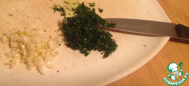 Пока варится наш картофель, готовим соус цахтон, который обычно подают к мясным блюдам и блюдам из картофеля. Мелко рубим чеснок, укроп (по желанию). Укроп желательно резать без стебельков, только листики.