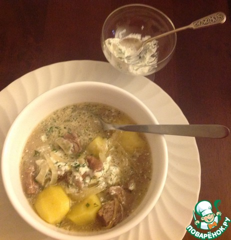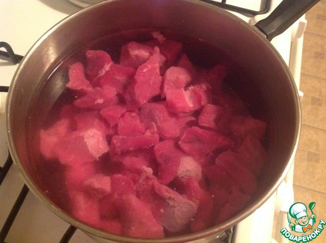 Это блюдо можно готовить как из говядины, так и из баранины. Но баранину я никогда не употребляю, из чувства зодиакальной солидарности :)) (СВОИХ НЕ ЕДИМ!!) Поэтому готовлю исключительно из говядины. Итак, берем не постное мясо, чуть с жирком, режем на куски примерно по 5-6 см. (оно ещё уварится), заливаем холодной водой, чтобы вода накрывала мясо примерно на палец. Если хотите пожиже - воды добавьте чуть побольше. Пока закипает мясо, чистим картофель, лук, моем зелень.