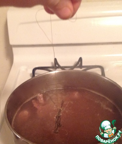 Итак, идём далее: Веточки сухого чабреца связываем ниткой, чтобы потом легче было вынимать, опускаем в бульон.