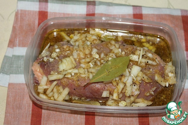 Приготовить маринад для мяса, смешав сок и цедру лимона, масло, уксус, кориандр, лук, чеснок, перец, соевый соус, лаврушку и соль по вкусу