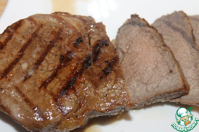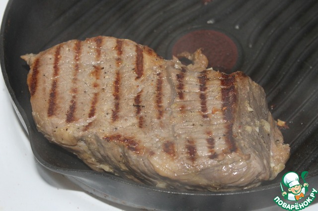 Кусок мяса обтряхиаю от маринада, лука и чеснока и обжариваю на сковороде гриль с двух сторон по 5 минут с каждой стороны по 2 раза, т. е. мясо жарится в итоге 20 минут, получается нежной средней прожарки сочный кусочек. Потом я его заворачиваю в фольгу и даю отдохнуть 5 минут