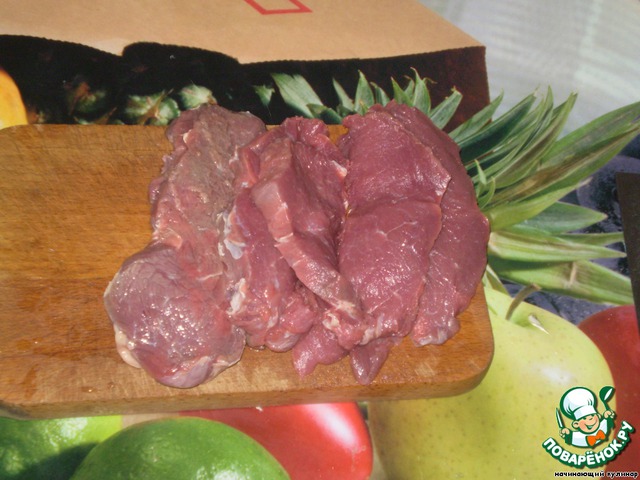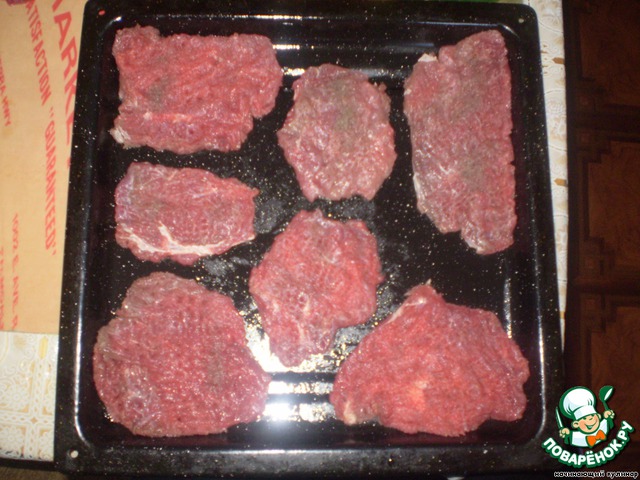 На смазанный маслом и разогретый противень выкладываем мясо так, чтобы куски не соприкасались друг с другом, иначе мясо даст сок, получится сухим и жестким.