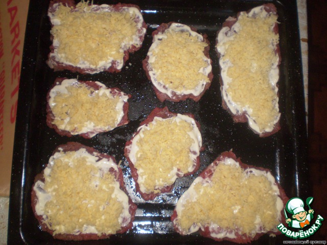 Солим, перчим, смазываем майонезом (сметаной), посыпаем тертым сыром и ставим в разогретую до 200 С духовку, жарим до образования поджаристой корочки, а затем уменьшаем температуру до 100-150 С и дожариваем.