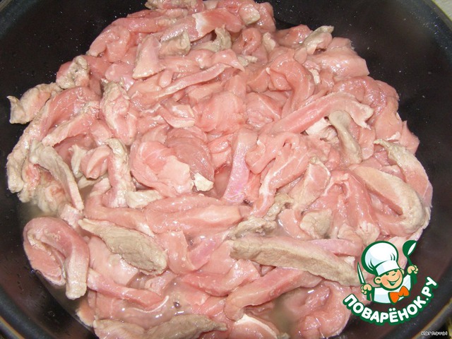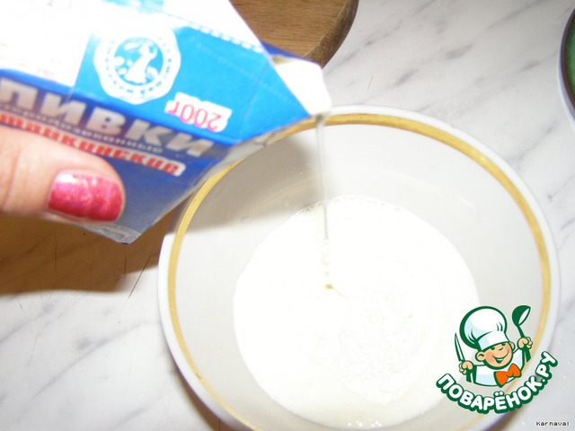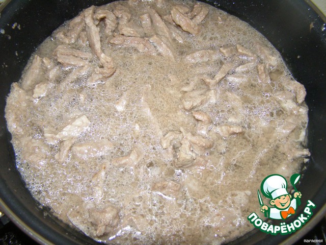 Муку развести сливками, рассердиться на образовавшиеся комочки(фотографировала одной рукой, поэтому - прозевала), протереть смесь через сито...В общем, добавить к почти готовому, мягкому мясу, предварительно посолив-поперчив по вкусу.