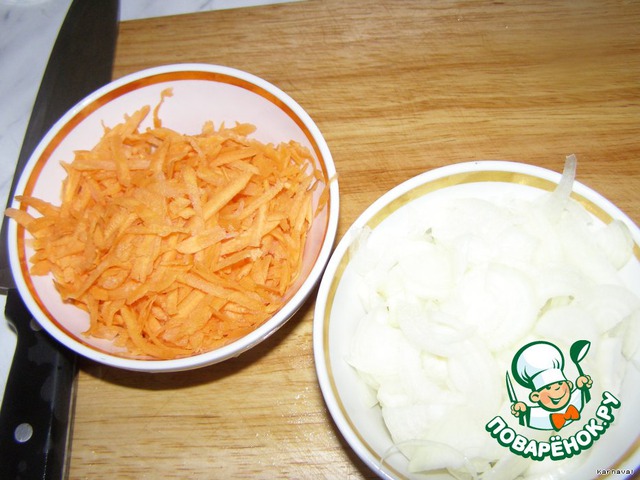 Тем временем порезать лук, потереть (порезать, по желанию), морковь.