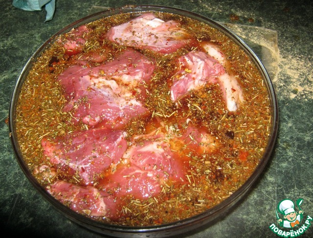 Все специи смешиваем, заливаем соевым соусом, добавляем мин. воду (можно и обычную) и замачиваем мясо часа на 4-5. я замоталась и оно у меня мариновалась ещё и всю ночь)))пошло только на пользу!