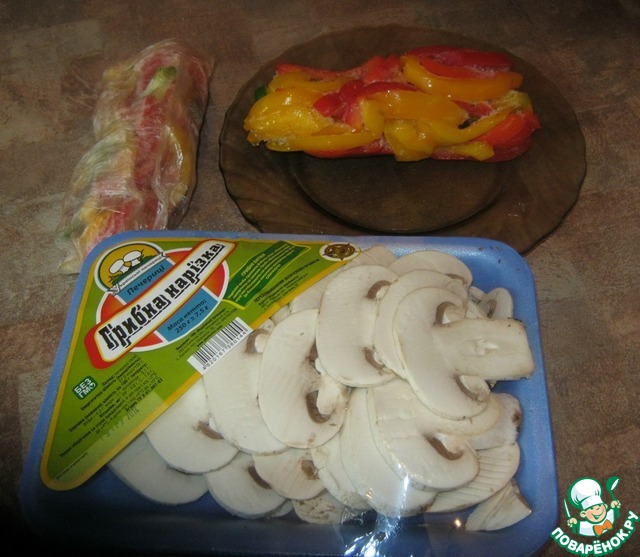 В этот раз мы начиняем грибами и болгарским перцем. Грибы я купила уже нарезанные (так удобнее). А перец у меня мороженный с осени (нарезанный соломкой)