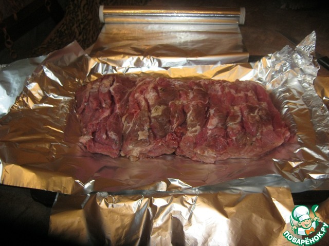 Замаринованное мясо обсушим слегка и выложим на застеленный заранее фольгой противень-смотрите на фото-я так заворачиваю мясо-очень удачное решение для полной изоляции мяса