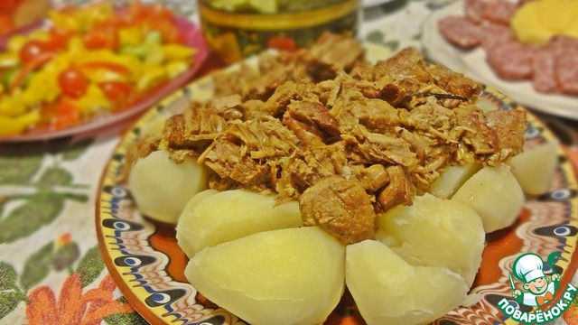 Нагреваем духовку до 100гр. С, ставим нашу форму с мясом и "забываем" про него на 7-8 часов.