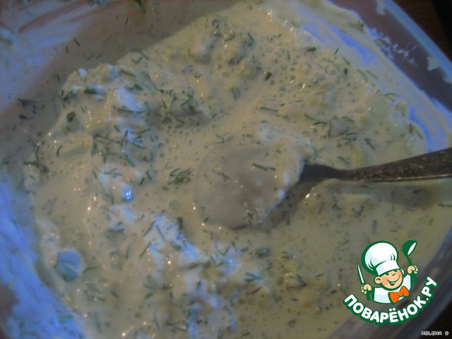 Соединить сметану с сыром и зеленью, влить немного воды или бульона, размешать