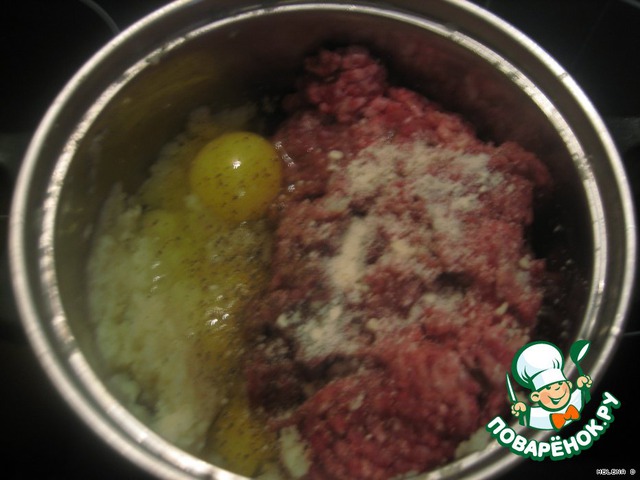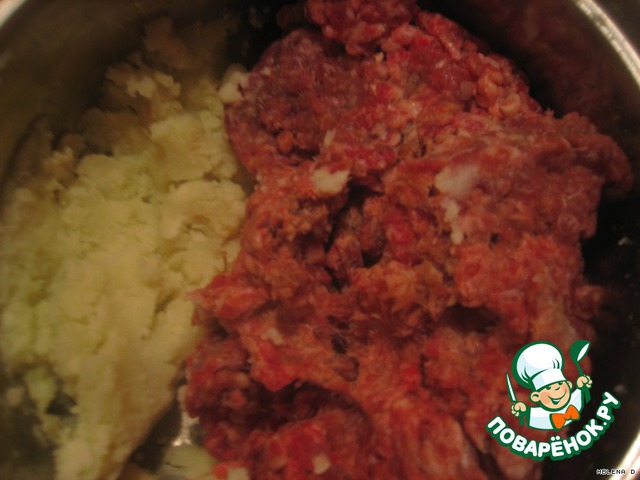 Заранее приготовить пюре. Выложить пюре в мясной фарш.