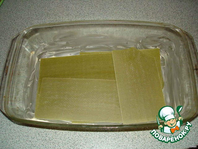 Форму смазываем сл. маслом и выкладываем слоями: соус, макаронное тесто (у меня шпинатное, но можно любое)........