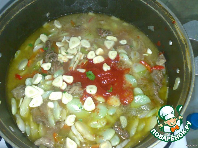 В кастрюлю с готовым мясом добавляем 1 стакан горячей воды, кладем свежую фасоль, перец, половину петрушки и половину чеснока. Все осторожно перемешиваем,чтобы не повредить нежную фасольку, даем закипеть и варим на медленном огне 10 мин.