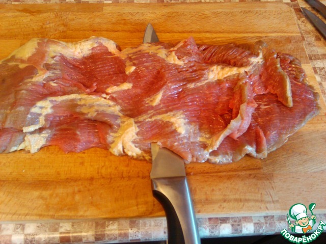 Его толщина около 1,5 см - я хочу разрезать его вдоль на 2 части, чтобы было потоньше (мясо лучше промаринуется и будет мягче). Ставим нож параллельно пласту мяса и разрезаем на 2 части
