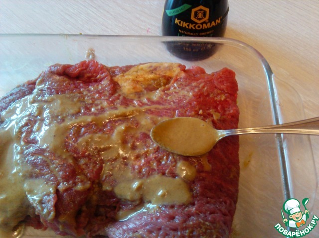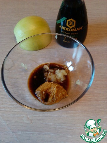 Теперь смешиваем пюре из сырого лука, горчицу и соевый соус "Киккоман"