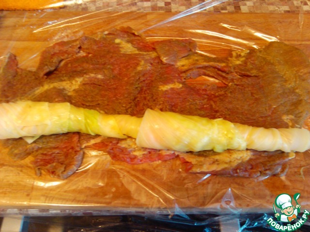 | Рулет из вырезки вещь, конечно, шикарная. Но из грудинки ничуть не хуже. Чуть посильнее подмариновать, чуть подольше потомить и ужин готов!! А начинка будет самая простая - морковь и капуста. |