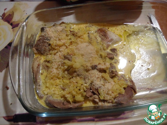 Смажьте сливочным маслом форму, выложите мясо, залейте сметаной с луком, посыпьте сухарями и запекайте в разогретой до 200 градусов духовке 15 минут.