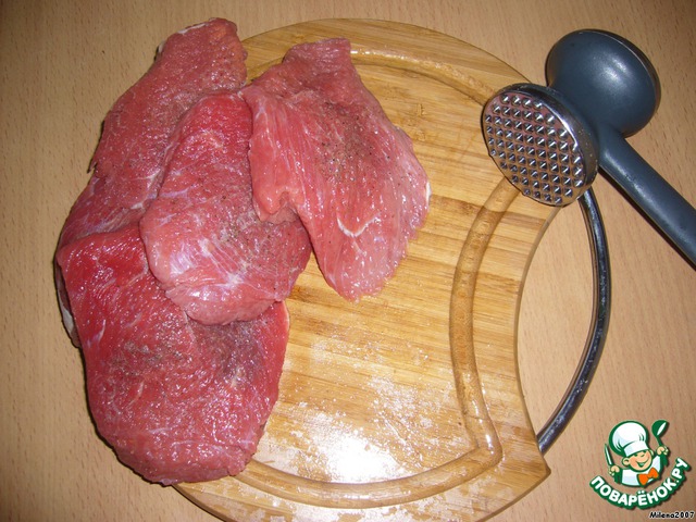 Кусочки мяса слегка отбить, посолить, поперчить.