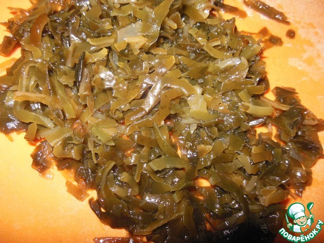 С морской капусты слить жидкость и мелко нарезать.