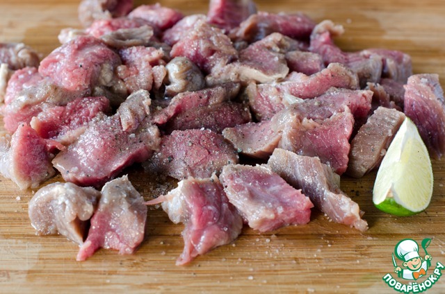 Молодую говядину (у меня мякоть) порезать небольшими кусочками, поперчить, посолить и сбрызнуть соком половины лайма.