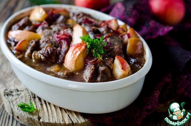 Отварной рис подавать с говядиной запеченной с яблоками и красным луком.