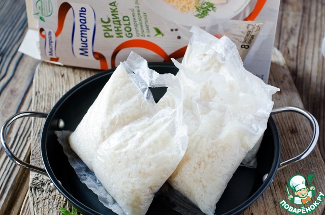 Для этого рецепта нам понадобится 3 пакетика риса Индика Gold от ТМ Мистраль. Опустить пакетики в кипящую подсоленную воду и варить на медленном огне в течении 30 минут.