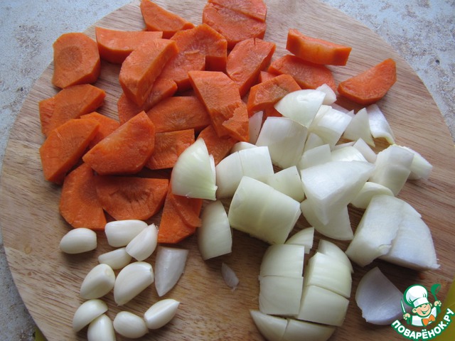 Готовлю овощи: нарезаю крупно морковь, лук, чеснок просто давлю ножом.